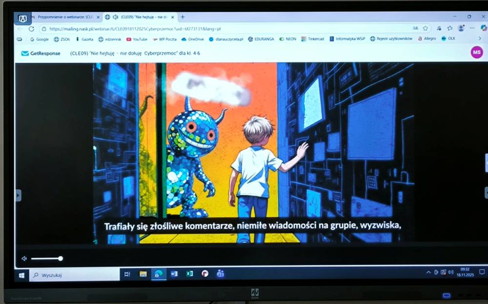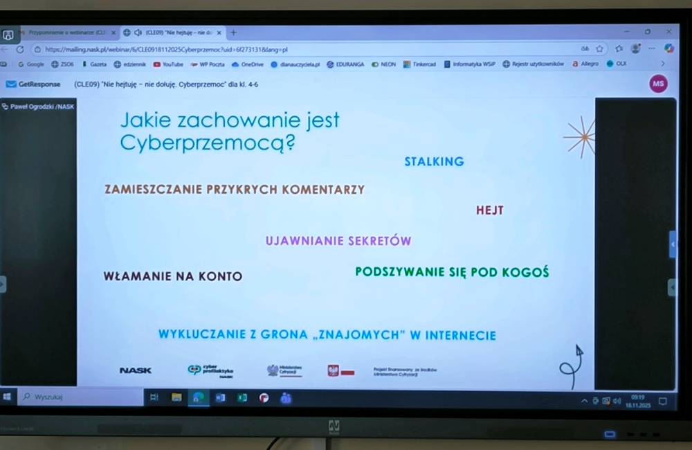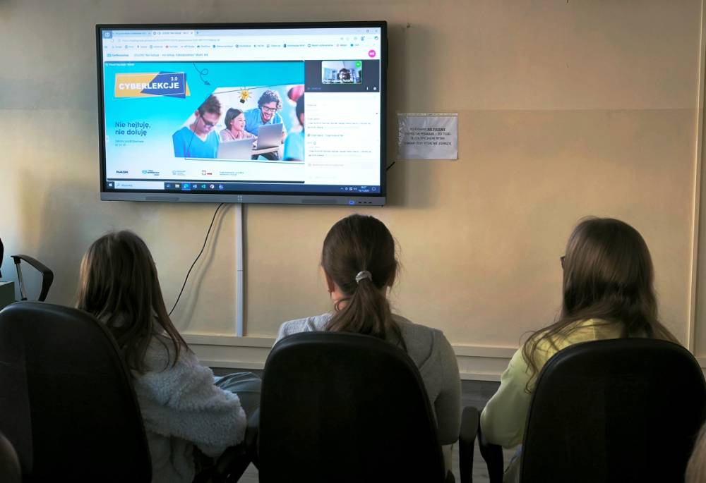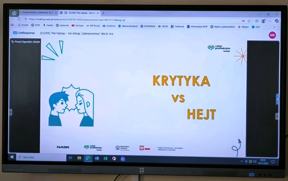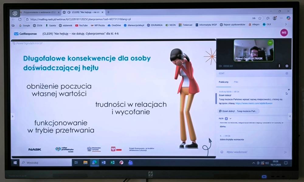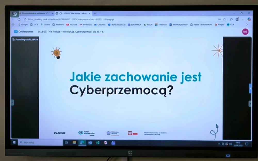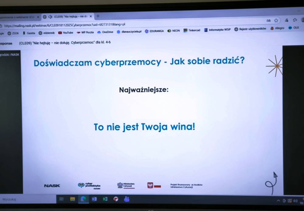 Uczniowie klasy 5 SP uczestniczyli w Cyberlekcji w formie webinarium "Nie hejtuję – nie dołuję. Cyberprzemoc". Na tej lekcji porozmawiano o cyberprzemocy, problemie, który bardzo często pojawia się w klasach, ze szczególnym uwzględnieniem jego najpopularniejszej odmiany, czyli hejtu. Uczniowie dowiedzieli się, jak ten problem rozpoznać, czemu warto jak najszybciej zadziałać, gdy go zauważymy i w jaki sposób każda osoba w klasie może pomóc w jego powstrzymaniu.