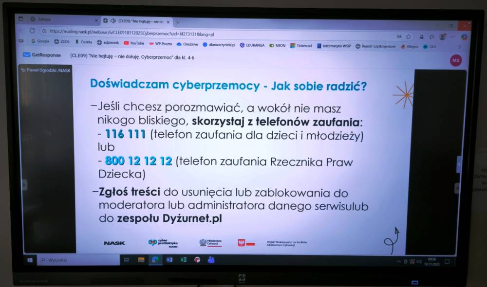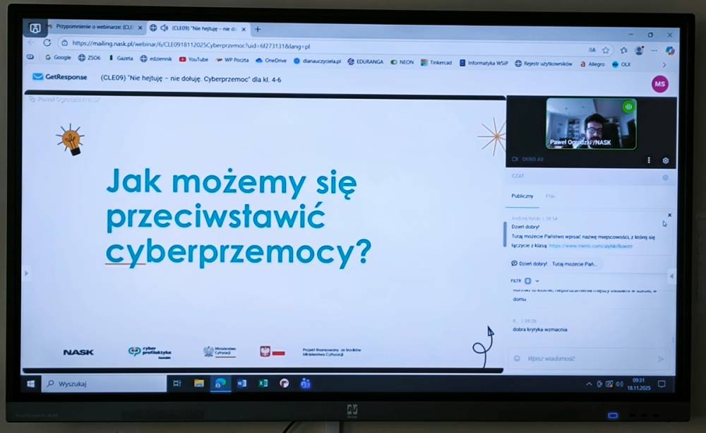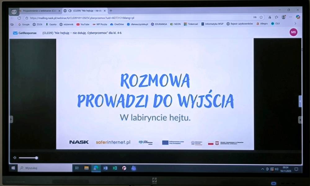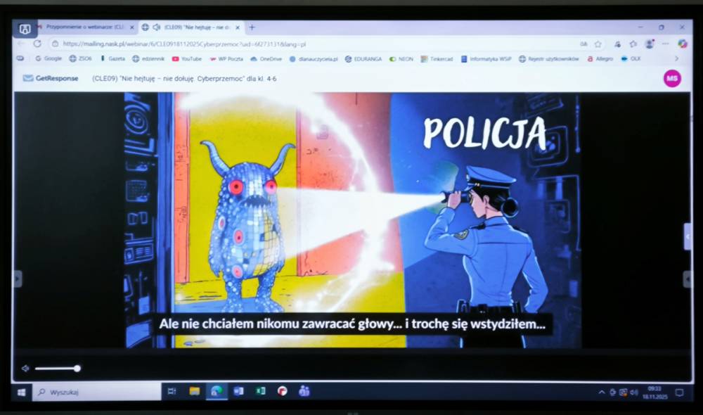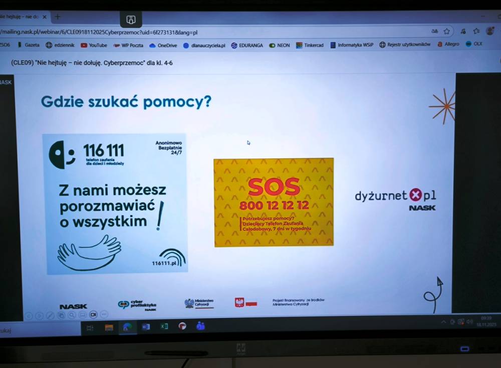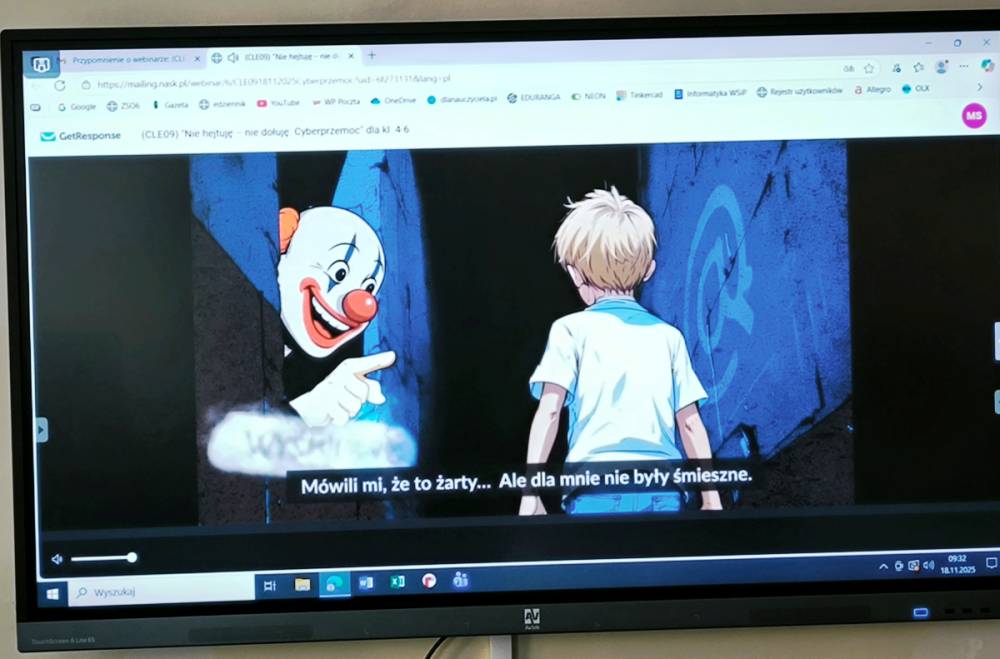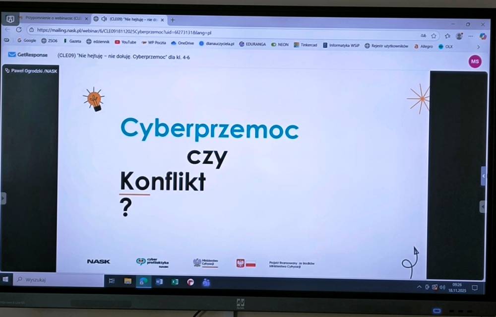 Uczniowie klasy 5 SP uczestniczyli w Cyberlekcji w formie webinarium "Nie hejtuję – nie dołuję. Cyberprzemoc". Na tej lekcji porozmawiano o cyberprzemocy, problemie, który bardzo często pojawia się w klasach, ze szczególnym uwzględnieniem jego najpopularniejszej odmiany, czyli hejtu. Uczniowie dowiedzieli się, jak ten problem rozpoznać, czemu warto jak najszybciej zadziałać, gdy go zauważymy i w jaki sposób każda osoba w klasie może pomóc w jego powstrzymaniu.
