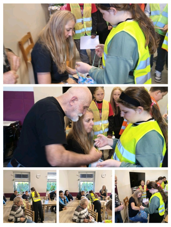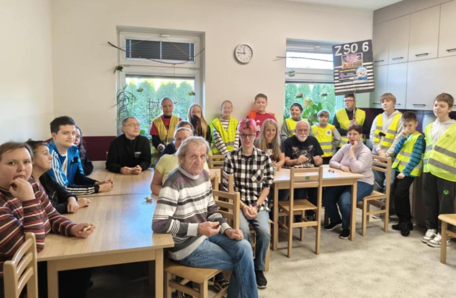 W poniedziałek udało się też zrealizować drugie spotkanie. Druga grupa pensjonariuszy ze Środowiskowego Domu Samopomocy „Zielona Przystań” wspólnie z uczniami klasy 6 przypomniała sobie o zasadach bezpiecznego poruszania się po drodze, wysłuchała prelekcji o tym jak ważne jest noszenie kamizelek odblaskowych i kasków ochronnych.