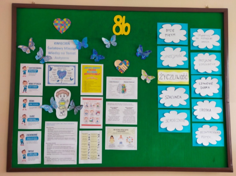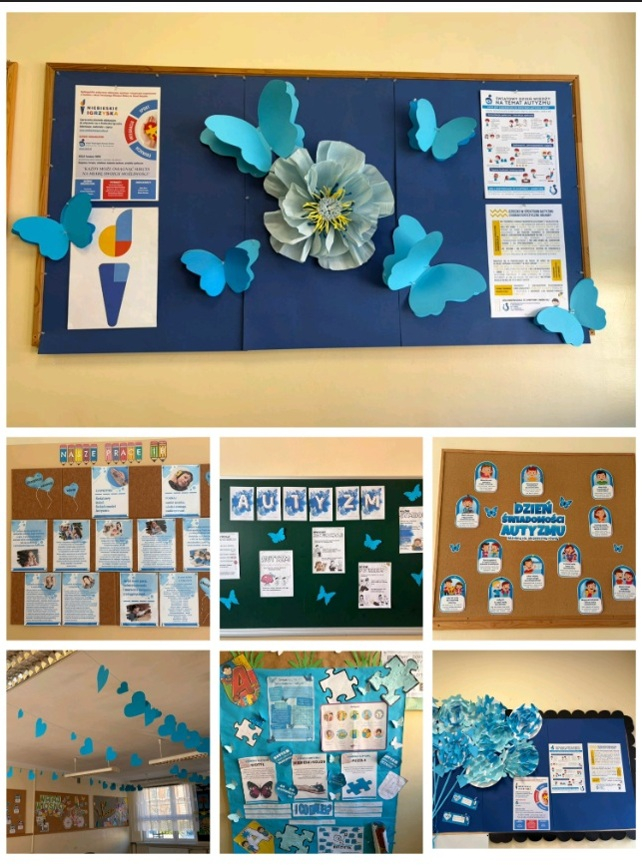W każdej klasie 1–3 i w klasie 8b oraz na świetlicy szkolnej, w ramach Niebieskich Igrzysk, w salach pojawiły się gazetki informacyjne poświęcone tematyce autyzmu.