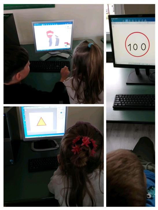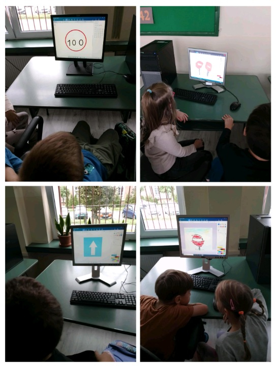 Klasa 1a na lekcji informatyki rysowała w Paint 3D znaki drogowe. Uczniowie równocześnie przypomnieli sobie o czym te znaki nas informują.