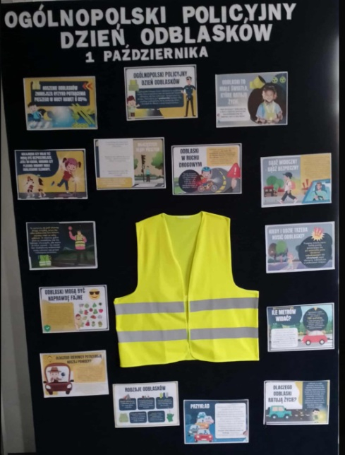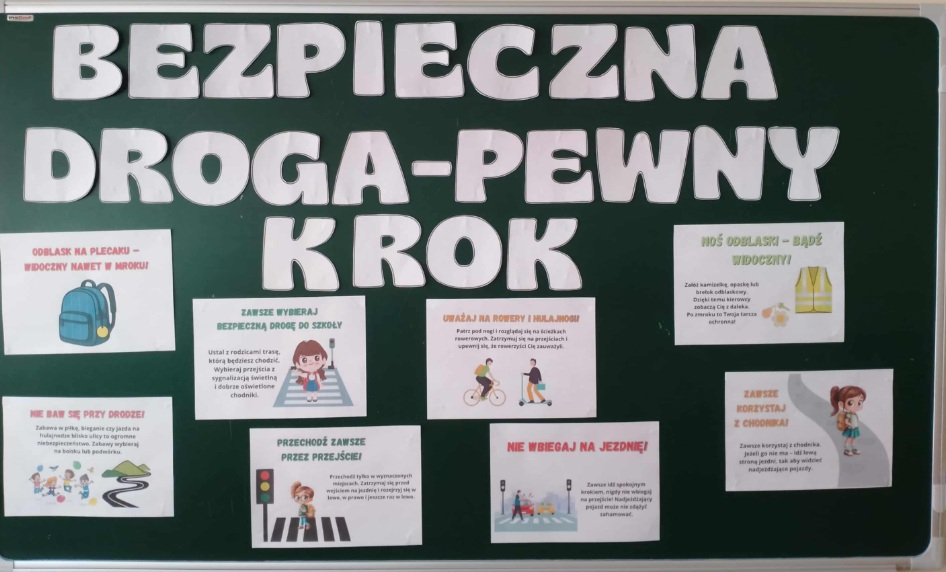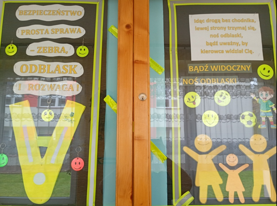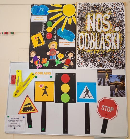 W ramach projektu Odblaskowa Szkoła zostały wykonane gazetki edukacyjne na temat bezpiecznej drogi do szkoły.