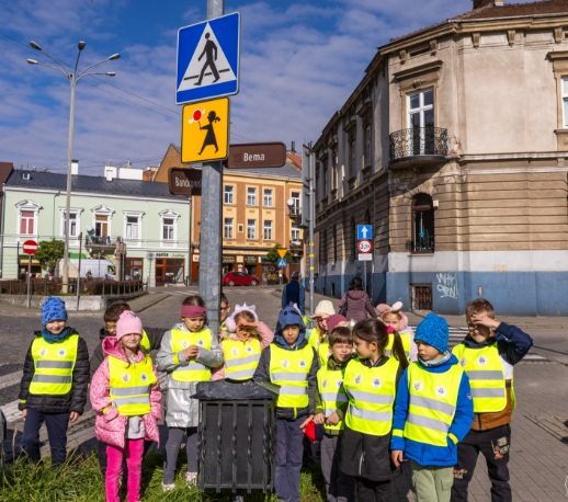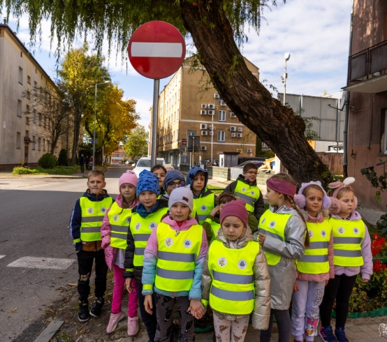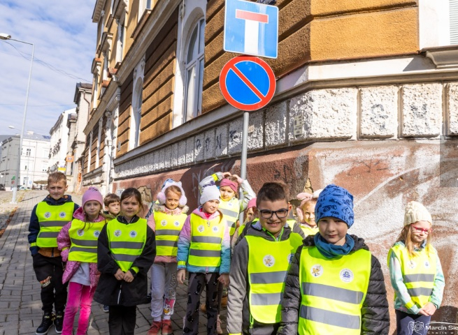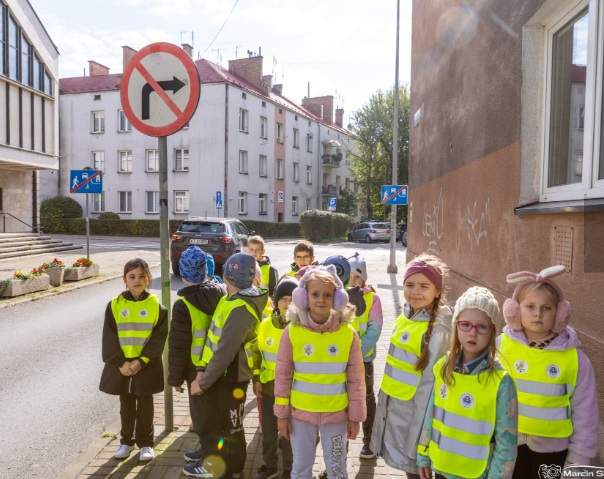 Klasa 1a na spacerze. Uczniowie rozpoznawali znaki drogowe jakie można znaleźć w okolicach naszej szkoły.