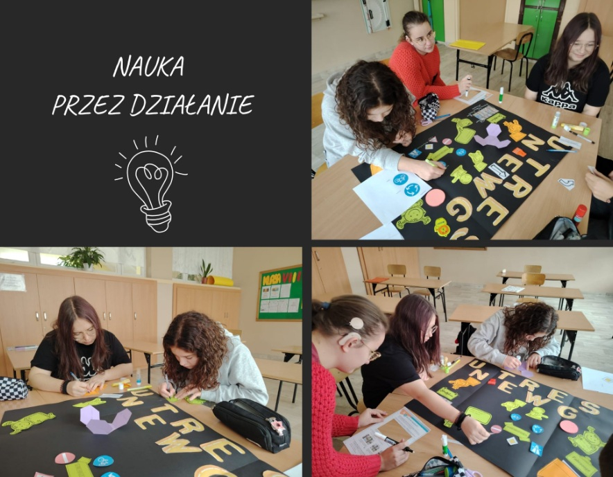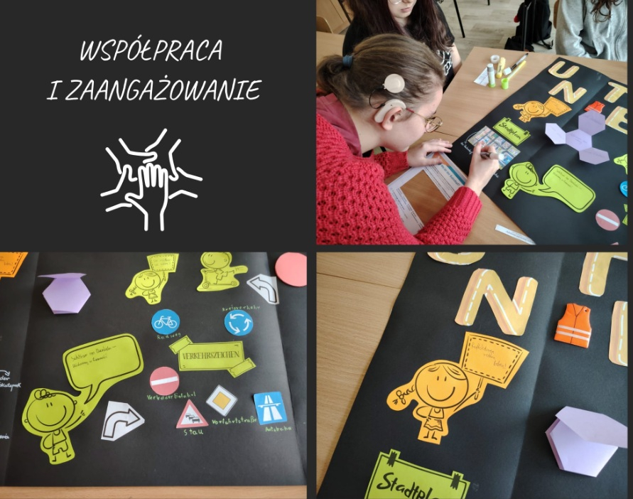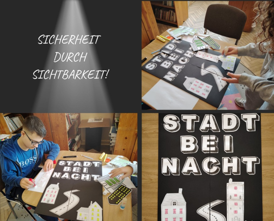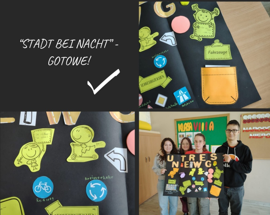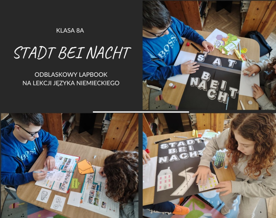 Uczniowie klasy 8A podczas lekcji języka niemieckiego połączyli naukę z kreatywnością, tworząc odblaskowy lapbook pt. „Stadt bei Nacht” („Miasto nocą”).