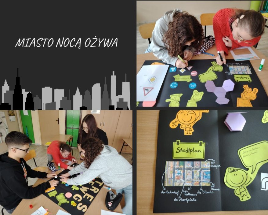 Zadanie wymagało nie tylko znajomości słownictwa związanego z miastem, ale też pomysłowości, zdolności manualnych i współpracy w grupie. Powstała kolorowa, pełna odblasków mapa nocnego miasta.