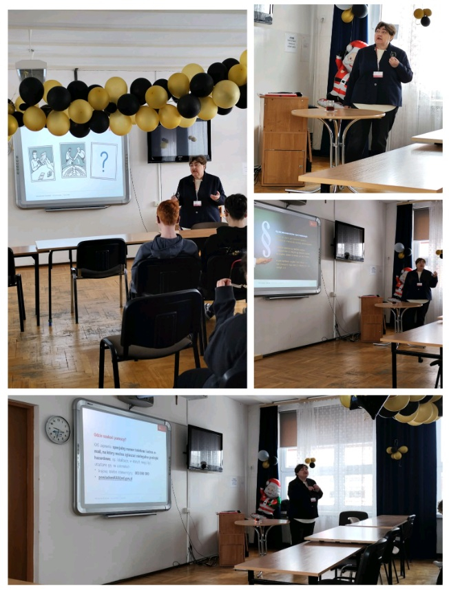Pani Wiesława Łyszczarz, podczas spotkania przedstawiła informacje czym jest nielegalny hazard. Uczniowie poznali zagrożenia wynikające z hazardu, w tym z pozornie bezpiecznych gier internetowych oraz skutki uzależnień od hazardu.