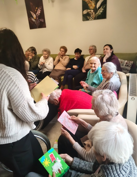 30 marca przedstawicielki Szkolnego Koła Wolontariatu z klasy 1LO wybrały się w odwiedziny do podopiecznych Środowiskowego Domu Samopomocy „Zielona Przystań”. Dziewczęta oprócz uśmiechu, szczerych i płynących prosto z serca życzeń przekazały pensjonariuszom wielkanocne kartki świąteczne wykonane przez uczniów naszej szkoły i przedszkolaków biorących udział w konkursie plastycznym "Wielkanocne cuda". Nie mogliśmy się napatrzeć na szczęście, jakie malowało się na twarzy obdarowanych a także na łzy wzruszenia, które pojawiły się u niektórych osób. Ten dzień uświadomił nam, że niewielki gest wobec drugiego człowieka, szczera rozmowa lub po prostu chwila spędzona z drugą osobą są dużo cenniejsze od wszelkich dóbr wokół nas się roztaczających. Dziękujemy Paniom i Panom z „Zielonej Przystani” za pomoc w organizacji spotkania.