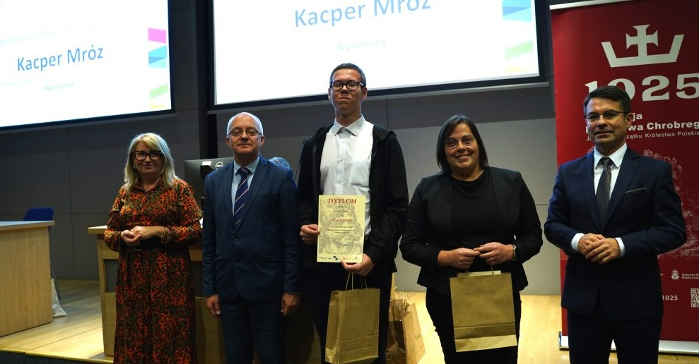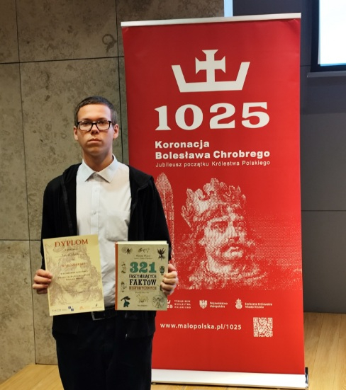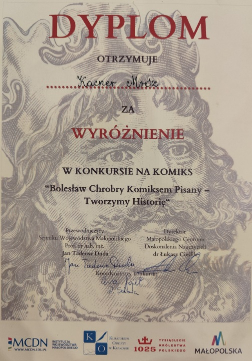 24 października br. w Auditorium Maximum Uniwersytetu Jagiellońskiego w Krakowie odbyła się uroczysta gala wręczenia nagród w konkursach zorganizowanych w ramach projektu „Tysiąclecie Królestwa Polskiego”. Nasz uczeń Kacper Mróz otrzymał wyróżnienie w konkursie komiksowym "Bolesław Chrobry Komiksem Pisany - Tworzymy historię".