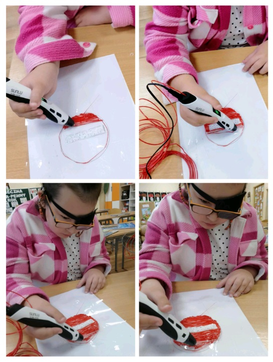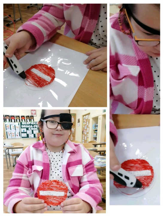 Na zajęciach rewalidacji indywidualnej z tyflopedagogiem uczennica wykonała przy pomocy długopisu 3D znak drogowy ćwicząc przy tym koordynację wzrokowo- ruchową, motorykę małą, koordynację przestrzenną i koncentrację uwagi.