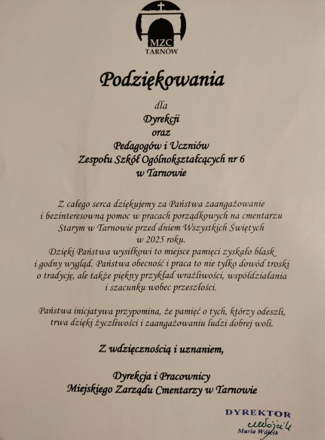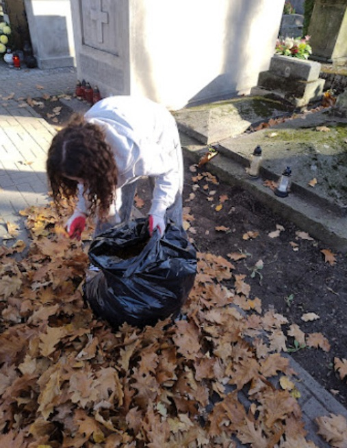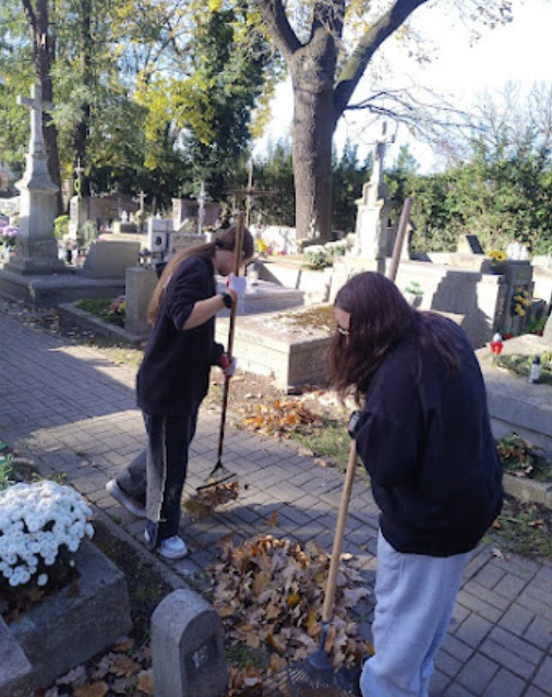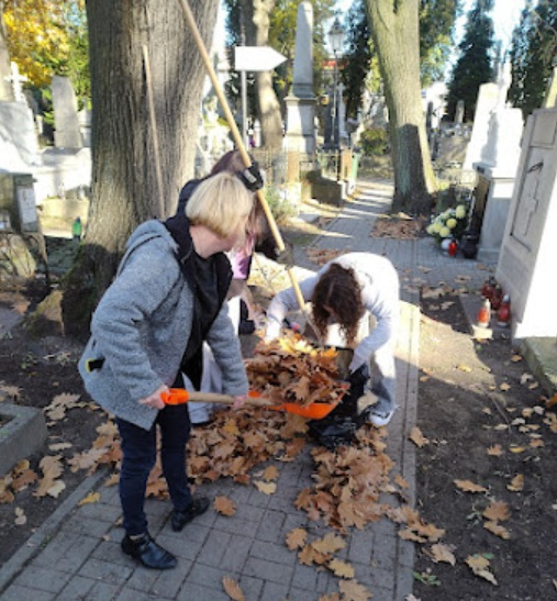 W przeddzień Święta zmarłych wolontariuszki z klasy 8 wzięły udział w corocznym sprzątaniu Starego Cmentarza w Tarnowie. Wspólnie sprzątałyśmy alejki w najstarszej części cmentarza, uzbierałyśmy 6 worków liści. Przy okazji pobytu na cmentarzu uczennice odwiedziły grób, poznały sylwetkę burmistrza Tarnowa Tadeusza Tertila. Wstąpiłyśmy też do otwartej kaplicy Sanguszków. Obecny na miejscu prof. Mędzelowski opowiedział nam niezwykłą historię odkrycia bozzetto, czyli modelu sarkofagu królowej Jadwigi. A oto krótka relacja z działań na Starym Cmentarzu